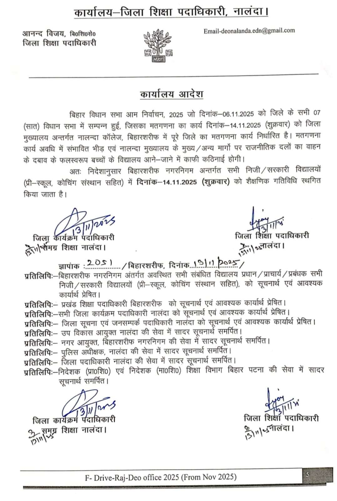 बिहार विधान सभा आम निर्वाचन, 2025 जो दिनांक-06.11.2025 को जिले के सभी 07 (सात) विधान सभा में सम्पन्न हुई, जिसका मतगणना का कार्य दिनांक-14.11.2025 (शुक्रवार) को जिला मुख्यालय अन्तर्गत नालन्दा कॉलेज, बिहारशरीफ में पूरे जिले का मतगणना कार्य निर्धारित है। मतगणना कार्य अवधि में संभावित भीड एवं नालन्दा मुख्यालय के मुख्य/अन्य मार्गो पर राजनीतिक दलों का वाहन के दबाव के फलस्वरूप बच्चों के विद्यालय आने-जाने में काफी कठिनाई होगी।