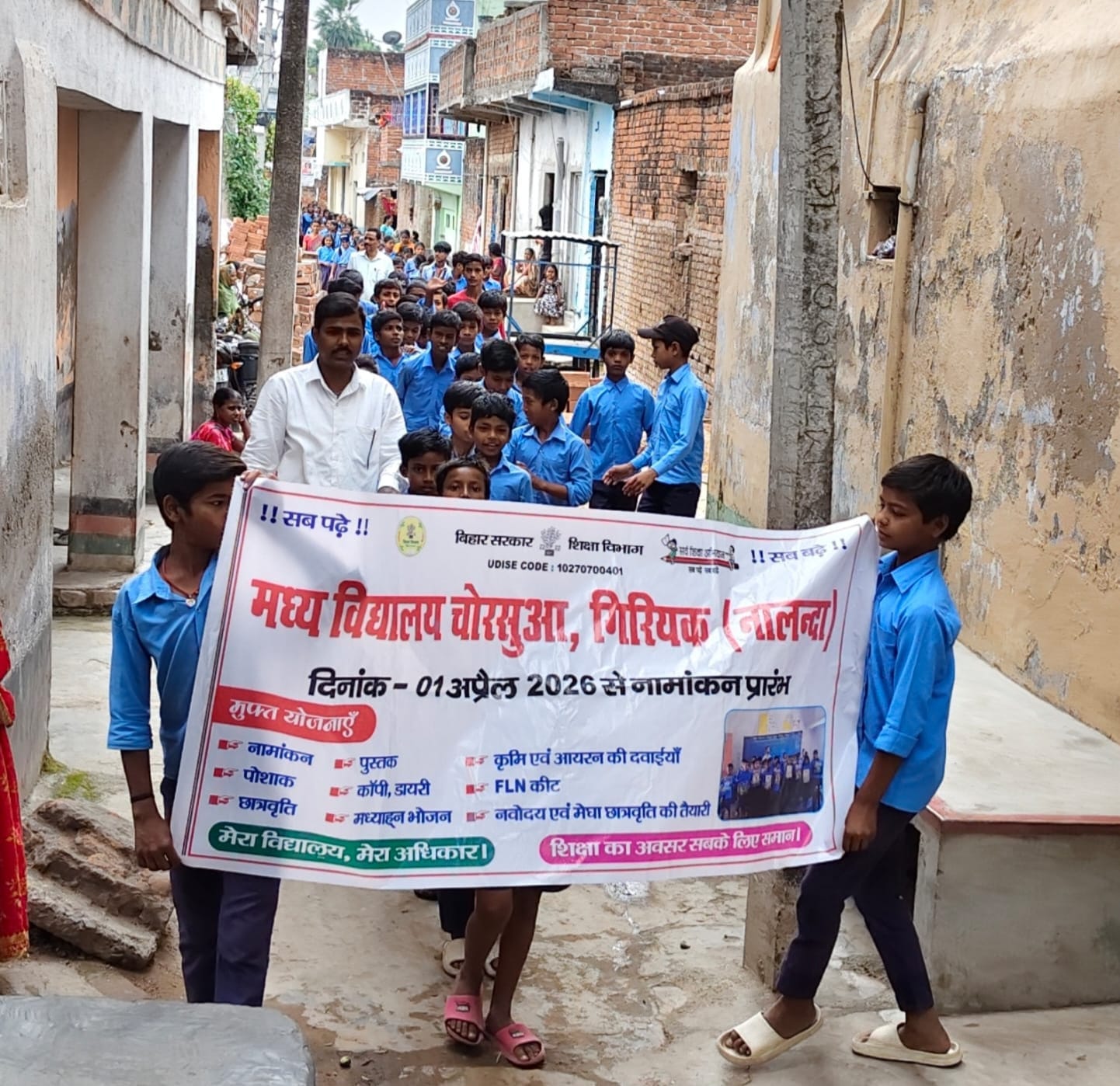 #ख़बरें Tv: गिरियक प्रखण्ड स्थित मध्य विद्यालय चोरसुआ गिरियक में प्रवेशोत्सव अभियान चलाया गया । जिसमें विद्यालय के सभी शिक्षकों, विद्यालय शिक्षा समिति के सदस्यों, बाल संसद व मीणा मंच के सदस्यों एवं बच्चों ने भाग लिया। सभी बच्चों ने पूरे गांव में रैली निकालकर बच्चों एवं अभिभावकों को सरकारी विद्यालय में नामांकन के लिए प्रेरित किया। प्रधानाध्यापक शशिभूषण प्रसाद ने बताया कि वर्तमान समय में सभी विषयों के प्रशिक्षित शिक्षक नौनिहालों के उज्जवल भविष्य हेतु तत्पर हैं। आज सरकार हर बच्चों को शिक्षित करने के लिए पुस्तक,डायरी, छात्रवृत्ति, पोशाक, दोपहर का भोजन, स्वास्थ्य जांच कर निःशुल्क और अनिवार्य शिक्षा प्रदान कर रहा है। शिक्षकों के मेहनत का ही परिणाम है कि विद्यालय के आठवीं क्लास के सभी बच्चे मेधा छात्रवृत्ति में सफल हुए हैं। इसके साथ ही साथ बच्चे सांस्कृतिक कार्यक्रम, स्काउट गाइड, खेल कार्यक्रम में भी बेहतर प्रदर्शन कर रहे है। उन्होंने सभी अभिभावकों को अपने बच्चों का नामांकन सरकारी विद्यालय में कराने का आग्रह किया। मेधा छात्रवृत्ति में सफल सभी बच्चों को विदाई दी गई।इस अवसर पर सुशीला कुमारी, मनोरमा कुमारी, आदित्य राज, मो. शाहबाज आलम, विजया लक्ष्मी, अरुण कुमारी, गुलशन रजक, बिन्दु सिन्हा, साक्षी सुमन ने भी घर घर नामांकन हेतु संपर्क किया।