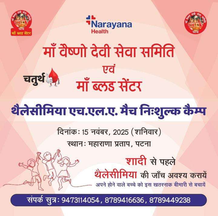 #ख़बरें Tv: पटना: थैलेसीमिया से पीड़ित नन्हें बच्चों के लिए बिहार में चौथी बार निःशुल्क HLA मैचिंग कैंप का आयोजन किया जा रहा है। यह कैंप शनिवार, 15 नवंबर 2025 को पटना के महाराणा प्रताप भवन में आयोजित होगा।