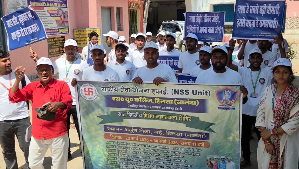 #ख़बरें Tv: हिलसा ( नालंदा ) एस.यू. कॉलेज, हिलसा के राष्ट्रीय सेवा योजना (एनएसएस) इकाई द्वारा संचालित एक सप्ताहीय सामुदायिक आउटरीच कार्यक्रम के चौथे दिन आज अर्जुन टोला, मई, हिलसा में “नशा मुक्ति एवं मद्य निषेध जागरूकता अभियान” के अंतर्गत सूखा नशा (खैनी, तंबाकू, सिगरेट, गुटखा, गांजा आदि) के विरुद्ध व्यापक जागरूकता कार्यक्रम चलाया गया।अभियान की शुरुआत समाजसेवी डा. आशुतोष कुमार मानव एवं एनएसएस प्रभारी डा. पिंकी कुमारी ने की ।
