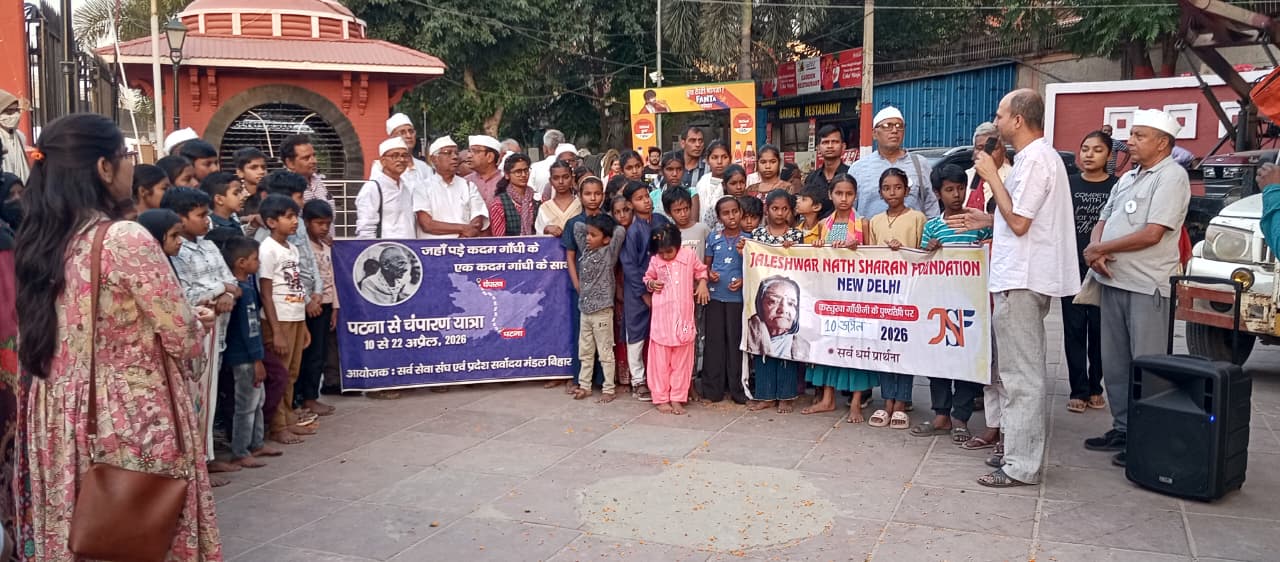#ख़बरें Tv: सर्व सेवा संघ के तत्वाधान में राष्ट्रीय एकता, सदभावना, भाईचारे और देश की समस्या के निदान हेतु 10 अप्रैल से 22 अप्रैल तक पटना से चम्पारण तक की एक यात्रा का शुरुआत पटना के ए. एन. सिन्हा इंस्टिट्यूट, गाँधी मैदान से शुरू की गई। यात्रा में सभी गाँधी विचार के साथी गण पद यात्रा कर शाम 5 बजे गाँधी घाट पहुँचे। रास्ते में पटना यूनिवर्सिटी के पास कसेरा बंधुत्व योजना,भारत के साथी रवी काँस्यकार और अंजली देवी ने सभी पद यात्री का स्वागत पुष्प वर्षा और सर्व सेवा संघ के अध्यक्ष श्री चन्द्र पाल जी को माल्यार्पण कर किए। साथ ही सभी साथी को लस्सी पीला कर सभी को गर्मी से निजात पाने का भी व्यवस्था किए। जब यात्रा गाँधी घाट पहुंची तो जलेश्वर नाथ फाउंडेशन, न्यू दिल्ली, राष्ट्रीय युवा योजना के सदस्यों के साथ साथ जी.बी.एम. अकादमी के बच्चों ने पुष्प वर्षा कर सभी का स्वागत किए। फिर सभी अतिथियों और यात्रा में शमील युवा साथियों को पुष्पमाला पहनाकर स्वागत किया गया।राष्ट्र सेवा दल के अध्यक्ष श्री चंद पाल जी और शेख हुसैन जी ने गाँधी जी और सुब्बाराव भाईजी के तस्वीर पर माल्यार्पण कर सर्व धर्म प्रार्थना का शुरुआत राष्ट्रीय युवा योजना, बिहार के सचिव नीरज काँस्याकार ने किया। सभी सर्व धर्म प्रार्थना के बाद राष्ट्र कवि तुकरो जी महाराज के गीत सबके लिए खुला हैं मंदिर गाया गया। फिर सभी को सम्बोधित करते हुए यात्रा के संचालक अशोक भारत भाई ने कहाँ की इस यात्रा में पशिचम बंगाल से सर्व सेवा संघ के राष्ट्रीय अध्यक्ष चन्दन पाल जी, उत्तर प्रदेश से राम धीरज जी, पंजाब से सुनील जी, महाराष्ट्र से मयूर भाई, झारखण्ड से umesh तोमर, बिहार से कृति बहन, शिवानी, तन्नू, सिस्टर फुलारेशन, विशाल, सुधीर, राजेंद्र, संजीव श्रीवास्तव, विष्णु, सौरभ जी पुरे यात्रा में साथ साथ चलेंगे।